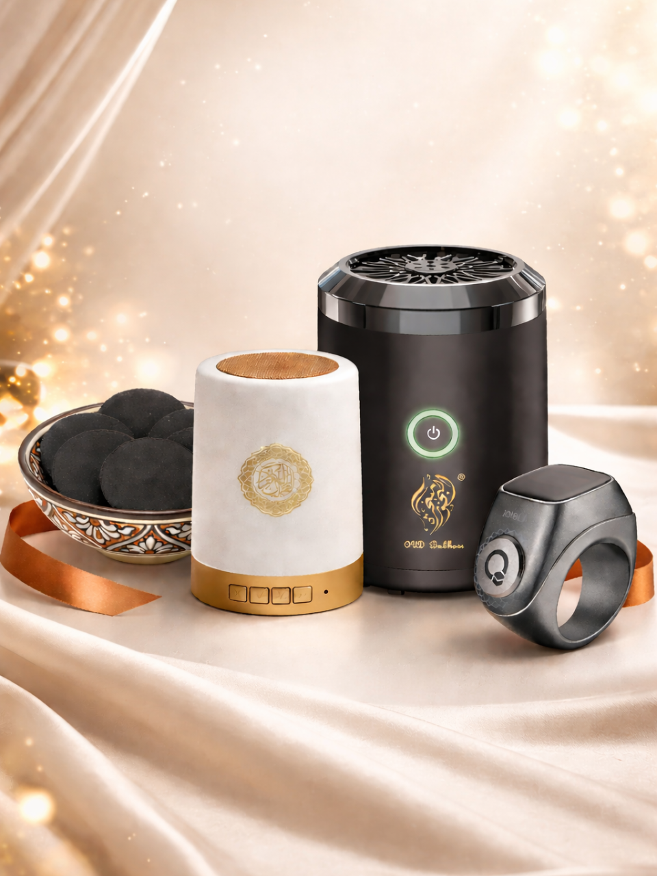 يتضمن موقد بخور، ومصباح قرآني محمول، وحلقة عداد للذكر، وكيس من البخور.